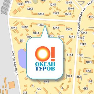 С МКАД поворот по указателю «Улица Николая Старостина». Первый светофор – стрелка «НАЛЕВО» поворачиваем на ул.Суздальская. Следующий светофор – стрелка «НАПРАВО» перед универсамом «КОПЕЙКА» на переулок между ул.Суздальская и ул.Новокосинская. Второй дом по правой стороне – офис турагентства ОКЕАН ТУРОВ.