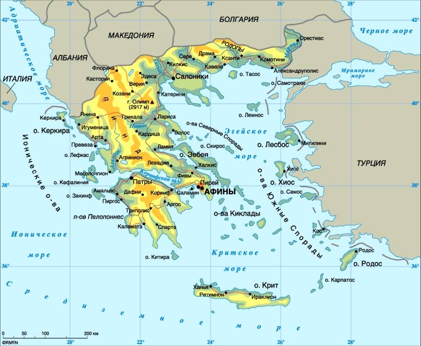 Греческая Республика расположена на юге Европы, на Балканском полуострове и прилегающих островах. На юге страна омывается Средиземным морем, на востоке Эгейским, а на западе – Ионическим. Площадь территории составляет около 132 тысячи квадратных километров, что почти в 3 раза больше Московской области. Примерно 20% территории приходится на острова, которых в составе Греции около двух тысяч. В материковой части 80% территории занимают горы и плоскогорья, причем на горы приходится четверть территории страны. Равнины расположены на востоке страны. Наиболее известные горы – Парнас высотой 2457 метров над уровнем моря и Олимп высотой 2917 метров. Столица Греции – Афины, из крупных городов можно отметить Пирей.