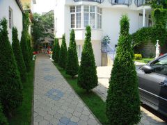 Территория отеля огорожена. Аллея колоновидных туй, вазоны с цветами, античная лужайка, альпийская горка с подсветкой располагают к уютной домашней атмосфере.