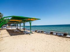 В 50-200 м от корпусов-коттеджей пансионата находится благоустроенный песчаный пляж с удобным для детей пологим заходом в море. Оборудован навесами, выдаются лежаки, есть кабинки для переодевания.