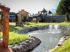 Гостям открывается изумительный вид на красоты природы, парки и дворцы, находящиеся в шаговой доступности. На территории комплекса располагаются 11 уютных домиков, в центре которых возвышается дивный фонтан. Современная детская площадка непременно привлечет внимание самых юных посетителей, позволив родителям быть спокойными за свое любимое чадо.